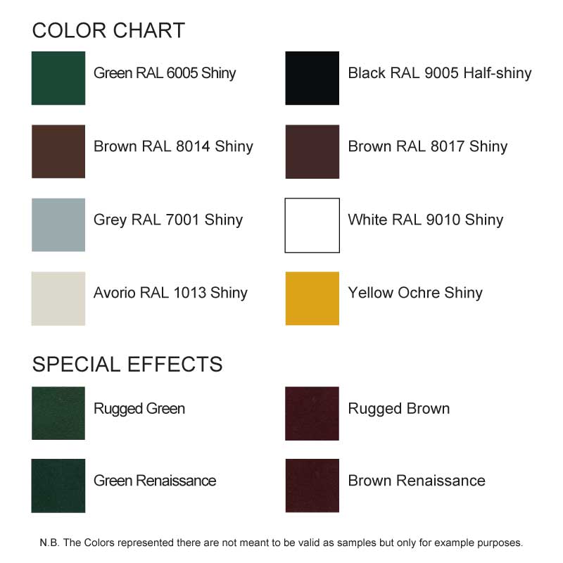 The coloring is made with the company painting machine, with powder coating in a wide range of available colors. This process, unlike the liquid paint, guarantees long life of the material and requires very little maintenance.