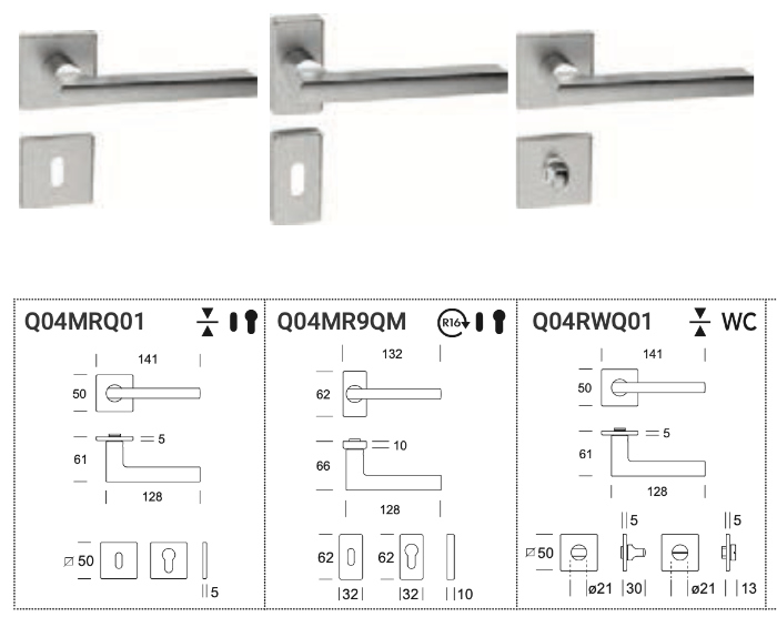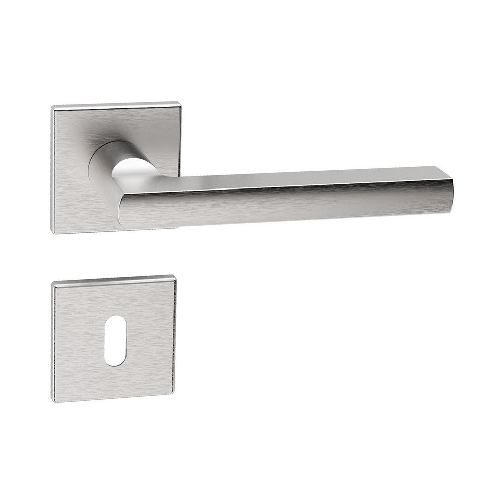 Athens Reguitti stainless steel door handle with fitting with slim square rosette 50x50x5mm.