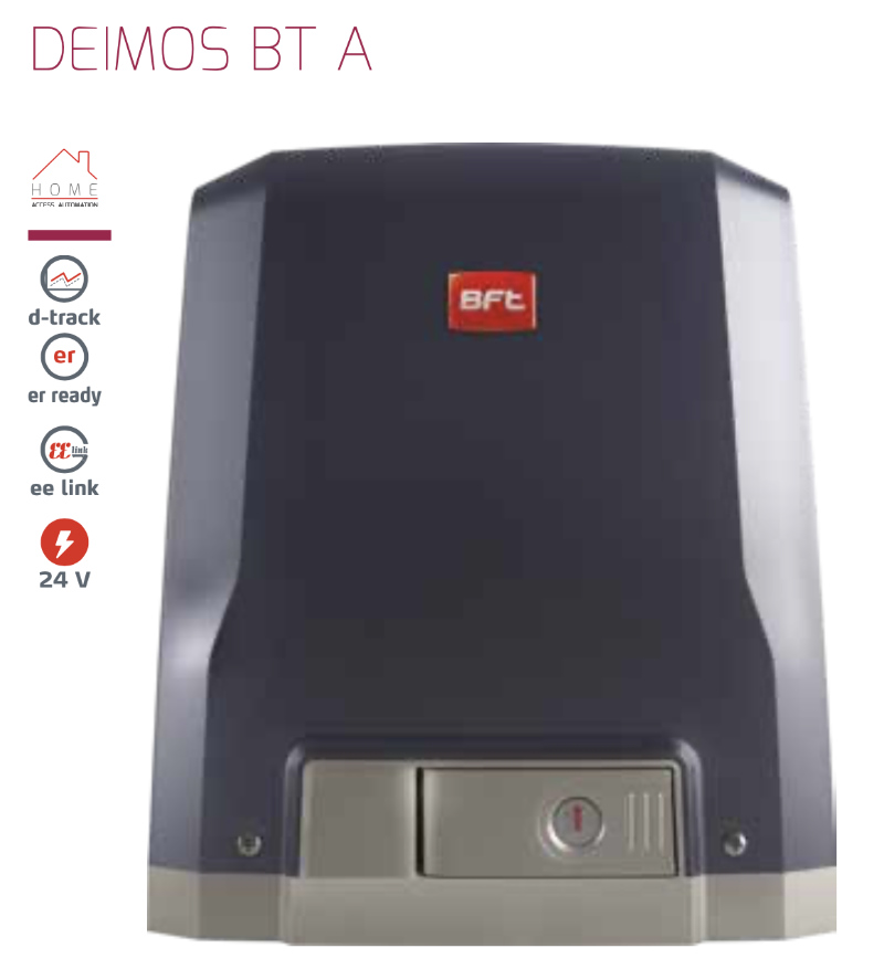 - 1 DEIMOS BT A400 : 24 V operator for sliding gates up to 400 kg in weight. Leaf speed 12 m / min;