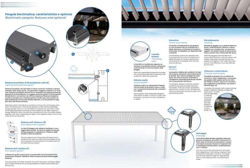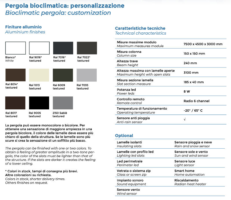 The large dimensions , the flexibility in integration with the architectural structures, the different installation options, the high quality of the materials used and the wide range of accessories make the Velia bioclimatic pergola the perfect choice for sun protection and covering areas residential and commercial.