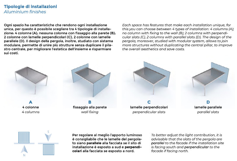 Each space has characteristics that make each installation unique, for this reason it is possible to choose between 4 types of installation : 4 columns (A); no column fixed to the wall (B); 2 columns with perpendicular slats (C), 2 columns with parallel slats (D). Furthermore, the design of the pergola, studied with a modular system, allows you to join several structures without duplicating the central pillar, to improve the aesthetics of the whole and save on costs.