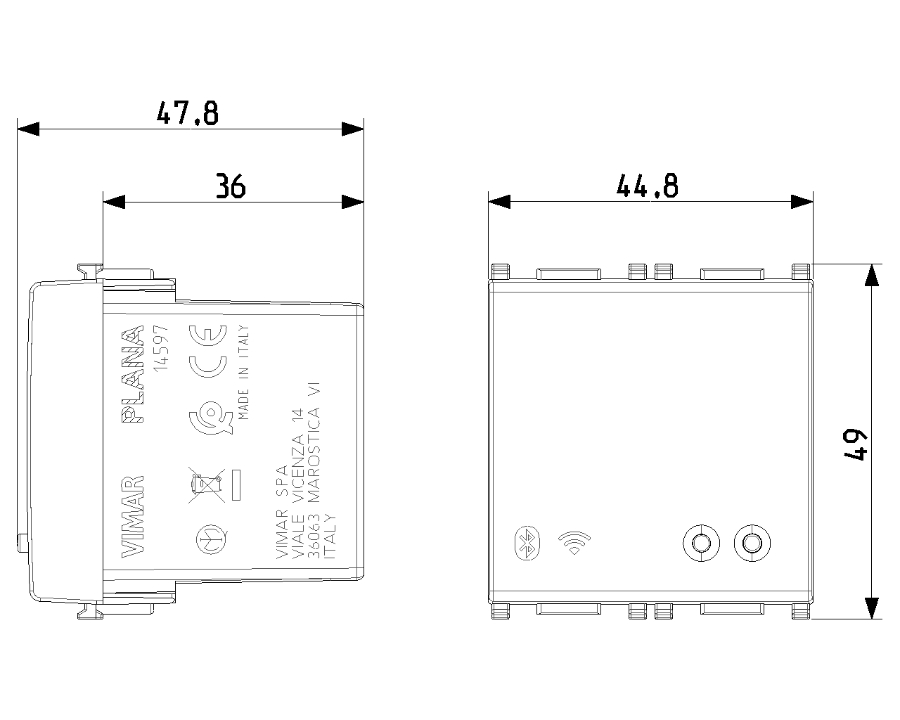 Gateway connected 2 Vimar modules for various civil series : Plana code 14597, Idea code 16497, Arkè code 19597, Eikon code 20597 .