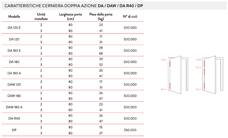 Double action hinge for installation directly on the wall or on the frame of the window, it only requires milling of the door without the counterframe. The installation time is reduced by up to 50% compared to that of a traditional hinge.