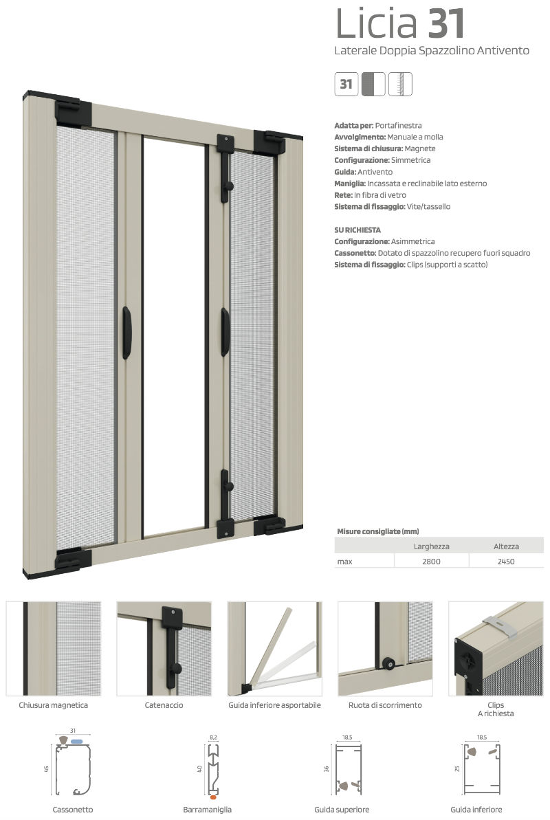 Double lateral mosquito net with reduced dimensions model Licia 31 Laterale Officine Rami. Made with spring winding and magnetic closure. 100% Italian production.