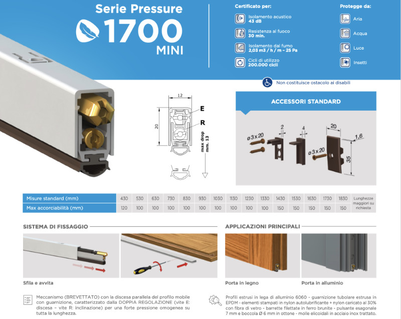 The Comaglio 1700 Mini draft excluder from the Pressure series is a built-in solution for swing doors, equipped with a patented mechanism with parallel descent of the mobile profile.