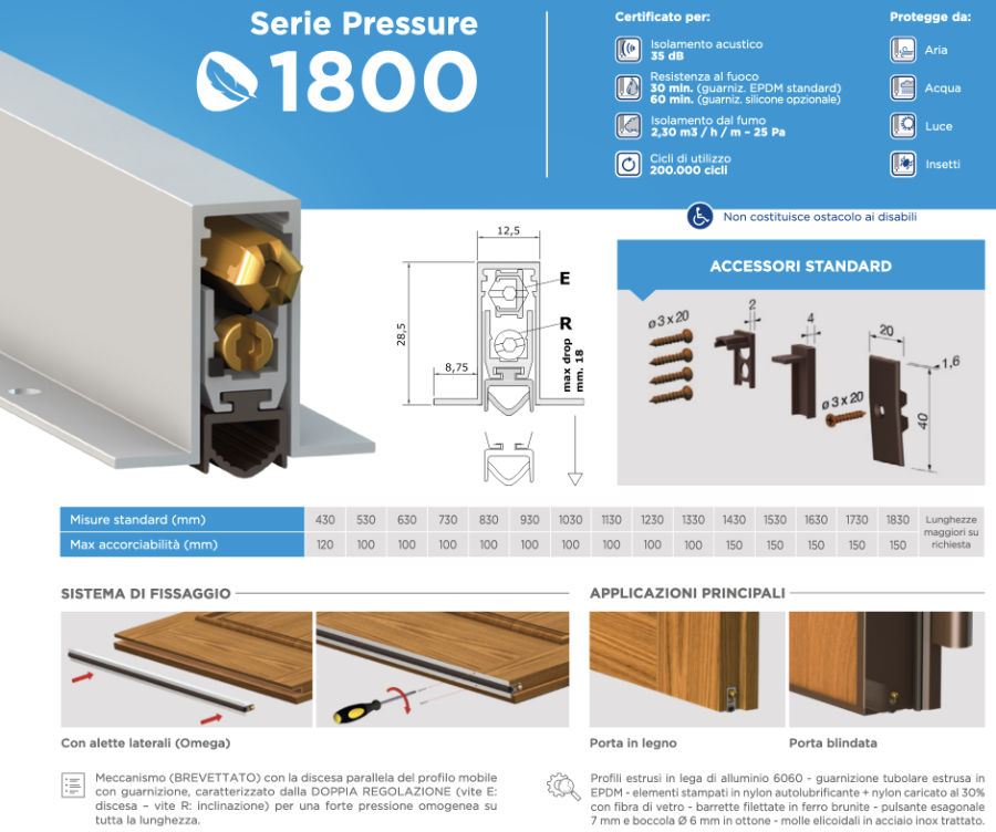 The Pressure Series is characterized by the patented double register mechanism ; it is a patented mechanism aimed at the perfect closure of the gap between the door and the floor, even on the opposite side to the push button.