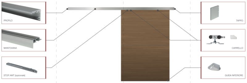This sliding door kit has a wall attachment and integrated valance, with a square section of only 62 mm per side.
