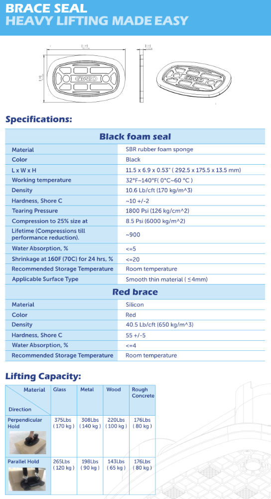Made of SBR rubber foam laminated with a silicone imprint, the GRABO BRACE SEAL prevents thin materials from bending, breaking or slipping during lifting.