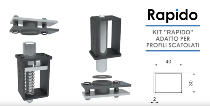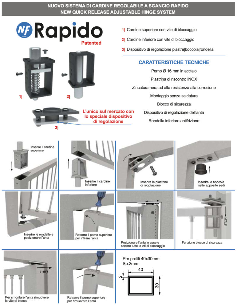 Simple to install , the Rapido Nova-Ferr kit allows you to position the safety grates in a few minutes and with the use of a few tools. This patented system allows the safety locking of the hinges and tips and the lateral adjustment of the door.