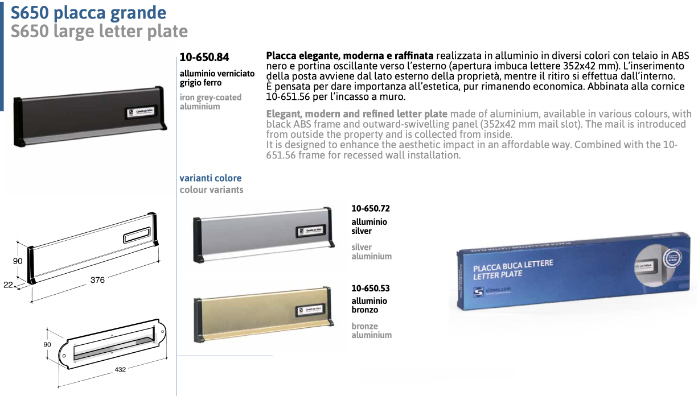 Large plate for Silmec S650 letterboxes made of aluminum in different colors with io frame in black ABS and swinging door outwards.