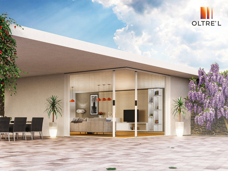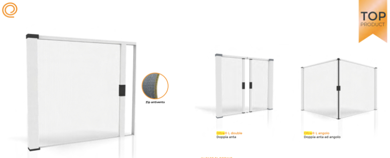 Oltre L Effezeta is a side windproof mosquito net with zip, ideal for covering extra dimensions and also available in the corner version. Furthermore, it is possible to choose between different variants, including Oltre L Double, the double-door flyscreen, and Oltre L corner, the corner flyscreen.