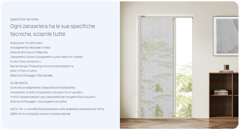 slow rise device, which increases the convenience and safety of use, especially in the presence of children or pets. The mosquito net is designed to be particularly suitable for French windows, with a manual spring winding system that ensures intuitive use and a magnet closing system for a safe and reliable hold.