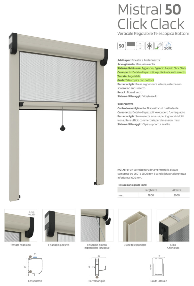 Vertical Mosquito Net for Window - Officine Rami Mistral 50 Click Clack - Adjustable Head and Telescopic Guide with Buttons