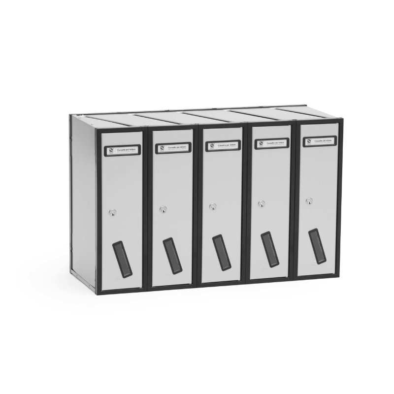 Mailbox of variable dimensions , made up of a variable group of magazine-sized boxes (3/4/5) and complete with aluminum cladding on all 4 sides, in the same color as the doors.