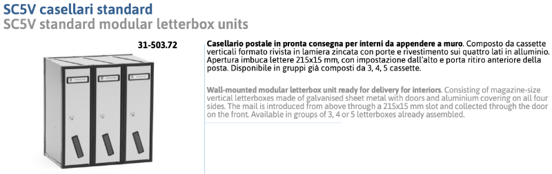 On the upper side there are the letterbox openings 215 x 15 mm. The boxes are equipped with aluminum doors with safety cylinder lock with two numbered keys, interchangeable name-holder peephole in plastic material.