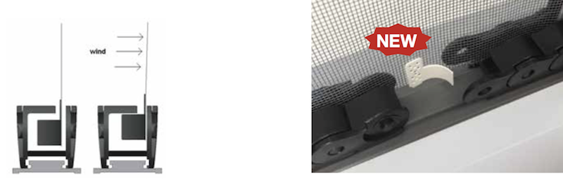 The flexible floor guide has a hooking system to the tracks preventing the same to rise up in case of wind.