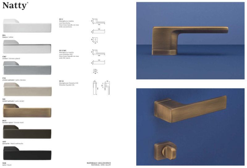 Manital demonstrates its technical and creative savoir-faire with the Natty handle , with an exclusive and elegant design. In this product, the rosette is integrated into the shape of the handle, creating a single, linear body.