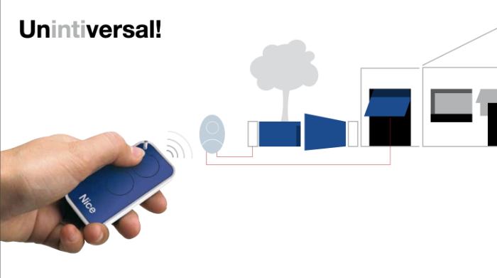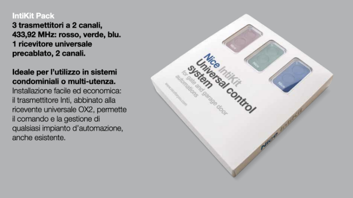 Nice IntiKit is a universal radio-controlled system for any type of gate and garage door .