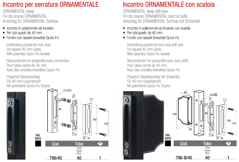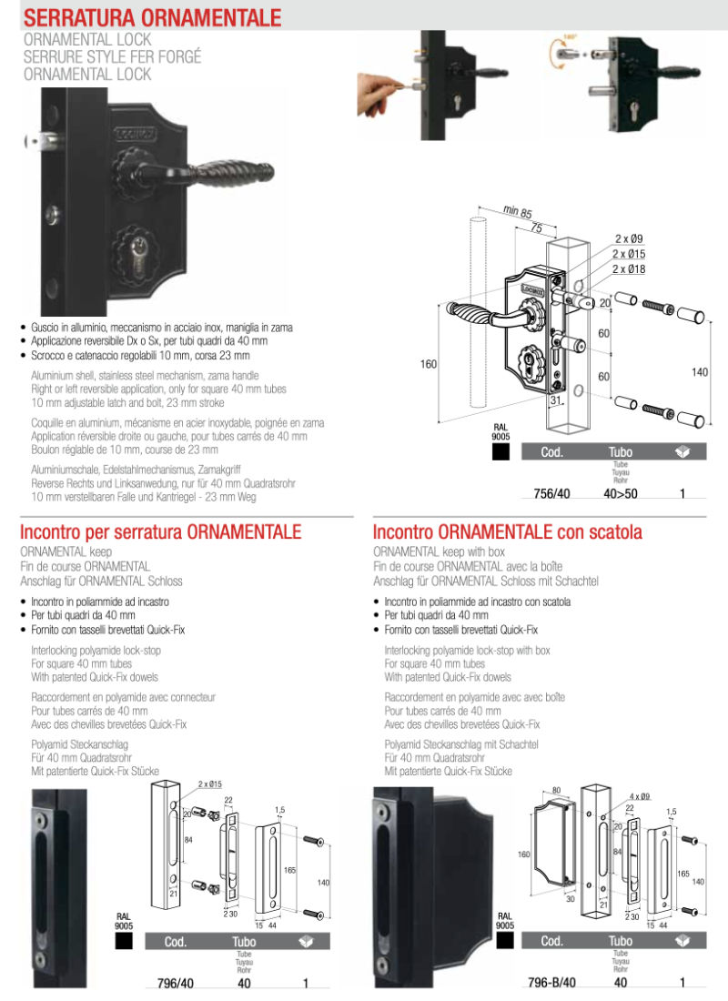 The lock application is reversible, adapting to both the right and left side of the gate and is ideal for 40mm square tubes. The latch and deadbolt are adjustable up to 10 mm with a travel of 23 mm, allowing precise locking and reliable closure.