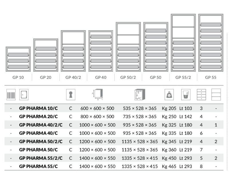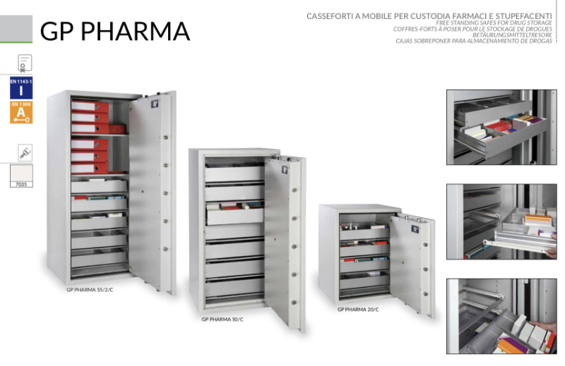 Gp Pharma Bordogna is a safe for pharmacies that protects drugs, narcotics and narcotics from a potential threat of robbery, burglary or internal theft.