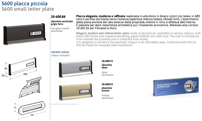Small plate for Silmec S600 letterbox made of aluminum in different colors with frame in black ABS and swinging door outwards.