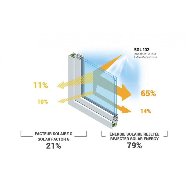 Reflectiv SOL 102 solar films are composed of two layers of vacuum metallized polyester, a strong adhesive and a protective film that is removable during installation. They are also designed to be scratch resistant, ensuring durability and quality over time.