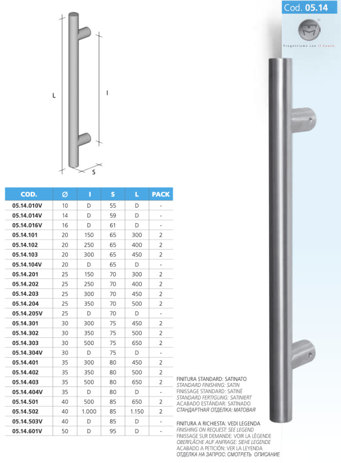 Straight pull handle in satin, polished or painted stainless steel of AISI 316L or AISI 304 quality (select the variant), brand MPM code 05.14.