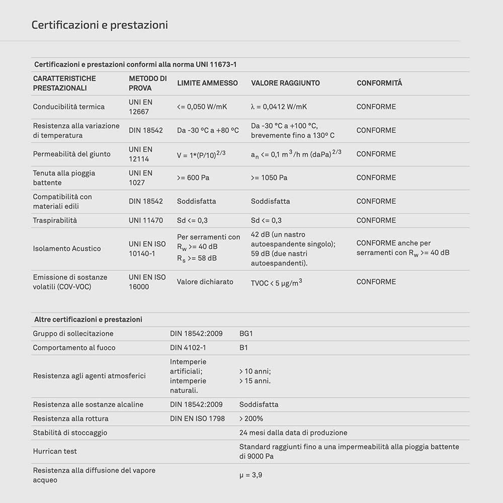 - Acoustic insulation (UNI EN ISO 10140-1): 42 dB (a single self-expanding tape) - 59 dB (two self-expanding tapes)