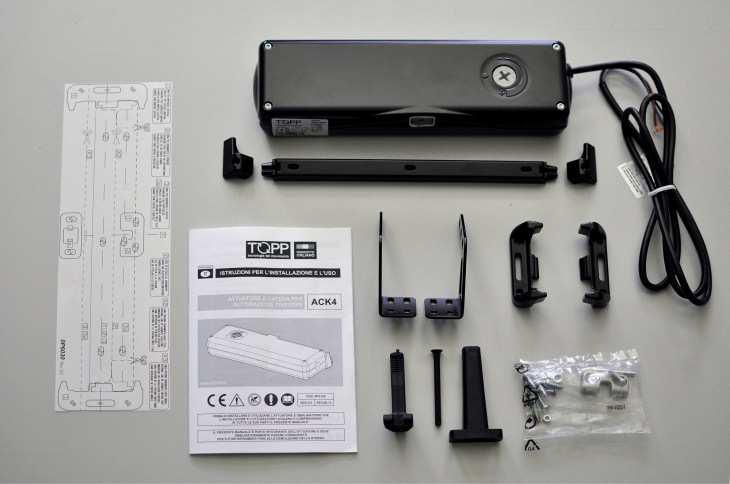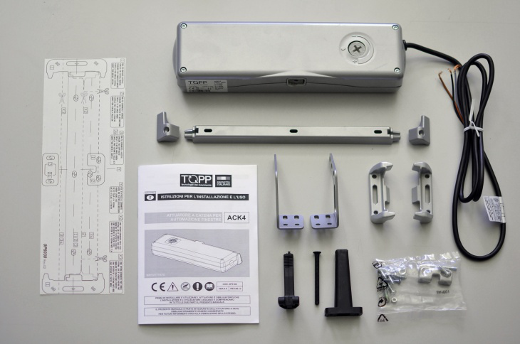 Included in the package: chain actuator, fixed front mounting bracket, vasistas bracket, connection to the window frame with pin and small parts package.