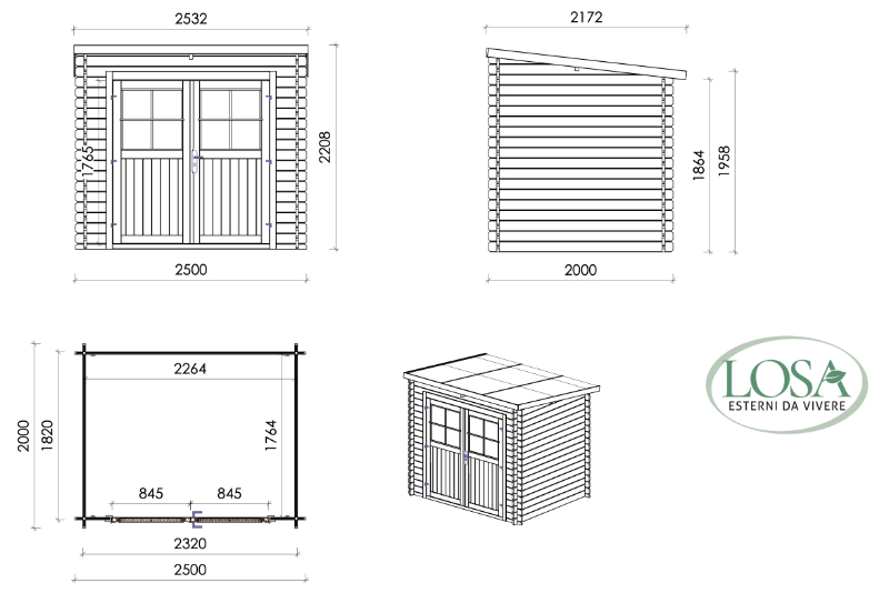 The house is supplied with bituminous felt which, if correctly assembled, guarantees a duration of approximately two/three years, therefore it is advisable to purchase and waterproof the house with a long-lasting covering such as bituminous tiles, corrugated roofing, slated sheath, etc.